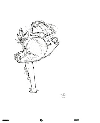 But there is a hidden danger in all that tight work, and it's called tracing! But "tracing" is an inadequate word for the task at hand. I have heard many times people exclaim that "the animation is so tight you could trace it" and I believe this sets us up with a false sense of security. I have seen a lot of beautiful and perfectly on model animation get "traced" by good clean-up artists and yet loose something in the translation. There is a more subtle dance that goes on when working on such work and requires us to be even more vigilant. There is the potential to let your guard down and rely to heavily on what you think you see, the result is a scene that isn't as good as it could be. Part of the problem is the use of your own rough on this type of work. When animation is on-model and you need to "trace" (I hate that word!) it, the worst thing you can do is do your own re-rough for it. There is a far greater chance of capturing the subtlety if you work on a fresh sheet of paper and work straight in black as opposed to roughing it out with a col-erase first. Every generation you get from the original is going to allow errors to creep in. For a good portion of the animation clean-up on both this and my clean-up blog I worked almost exclusively straight in black with no rough done first. This is not to brag , but to demonstrate the need to stay as close to the original as possible while still doing what is required as a clean-up artist. There's also a huge bonus to working this way which is that I'm not doing every drawing twice, which from a production stand point is a very good thing. This does take some practice but with time this technique can be developed to the point that even the slightly more off model work can be redrawn intuitively and not require a rough first. One thing to look out for is the very tight, beautifully drawn, but off model animation which at first glance looks as though it falls into this first category. For the most part this animation needs to be treated like its rougher counterpart and redraw will be required.